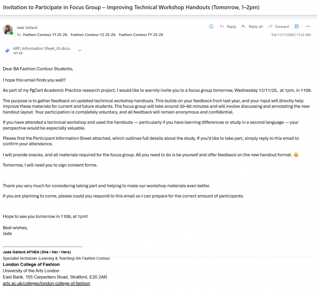 Session to be observed: 27th February 2025 – Technical workshop. Basque part 2, BA Fashion Contour year 1 group B., 9.30am – 12.30pm.
